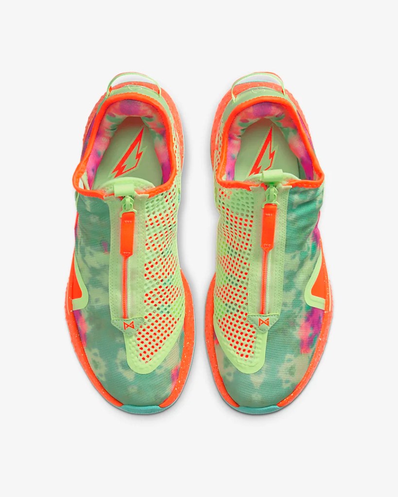 Clad in a tye-dye pattern, zippered mesh-covers up top deviate from the beverage company’s previous mostly-blue takes on the PG 4. Purples, greens, and teals “stain” the model’s toe box and lateral side, while “Barely Volt” tidies up medial construction. “Total Orange” bases, inspired by Gatorade’s lightning bolt logo, peek through the breathable, fastened component and are surrounded by collar lining, zippers, and heel tabs in the same citrus hue. Swoosh logos follow suit, but only on lateral walls given that The Sports Fuel Company’s aforementioned emblem replaces typical Nike-branding on the medial heel. The PG 4’s full-length Air cushioning system also joins in on the color medley, with midsoles opting-in for a speckled “Total Orange” arrangement, while the performance-outsole goes two-tone in teal and Gatorade’s signature orange.